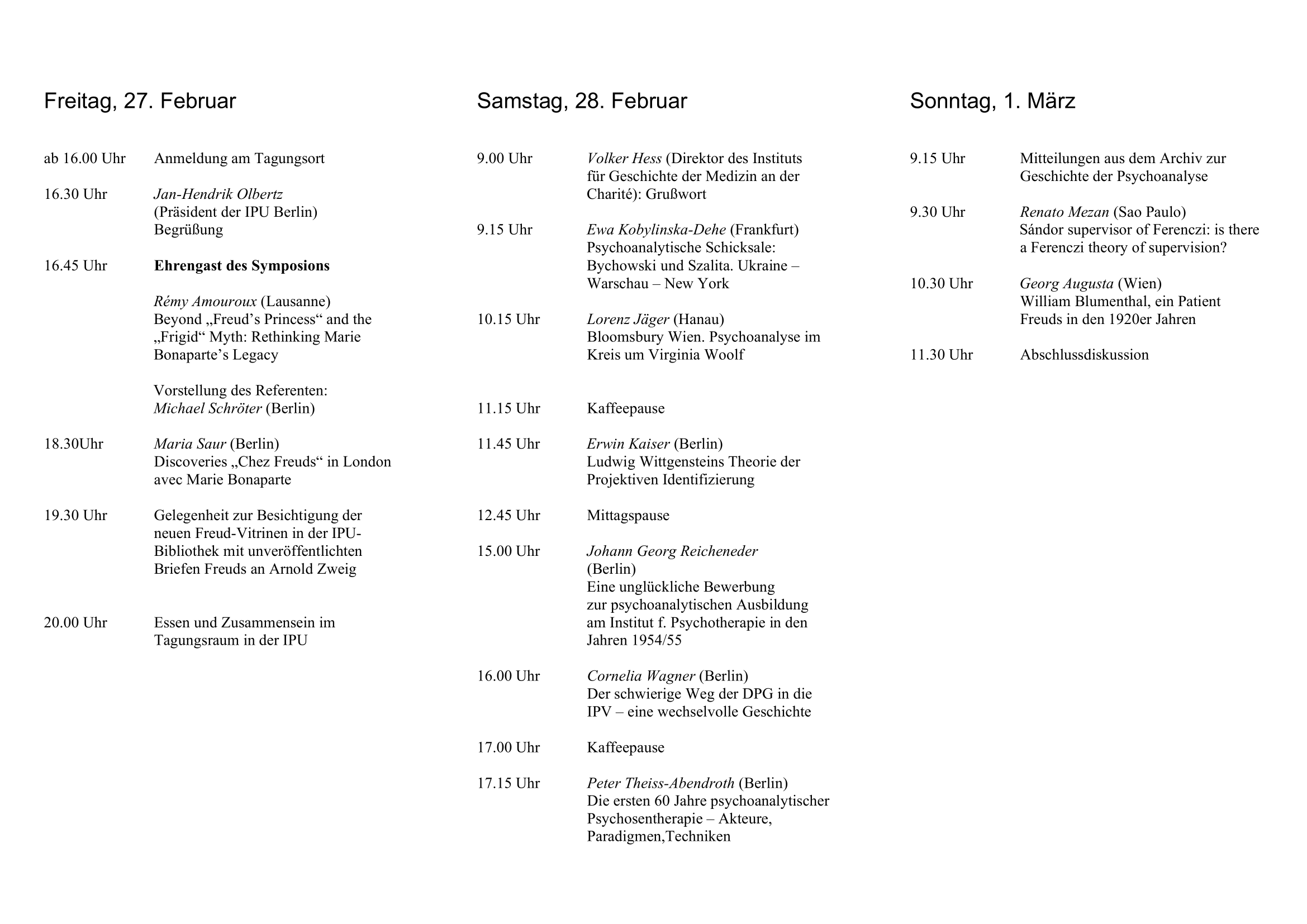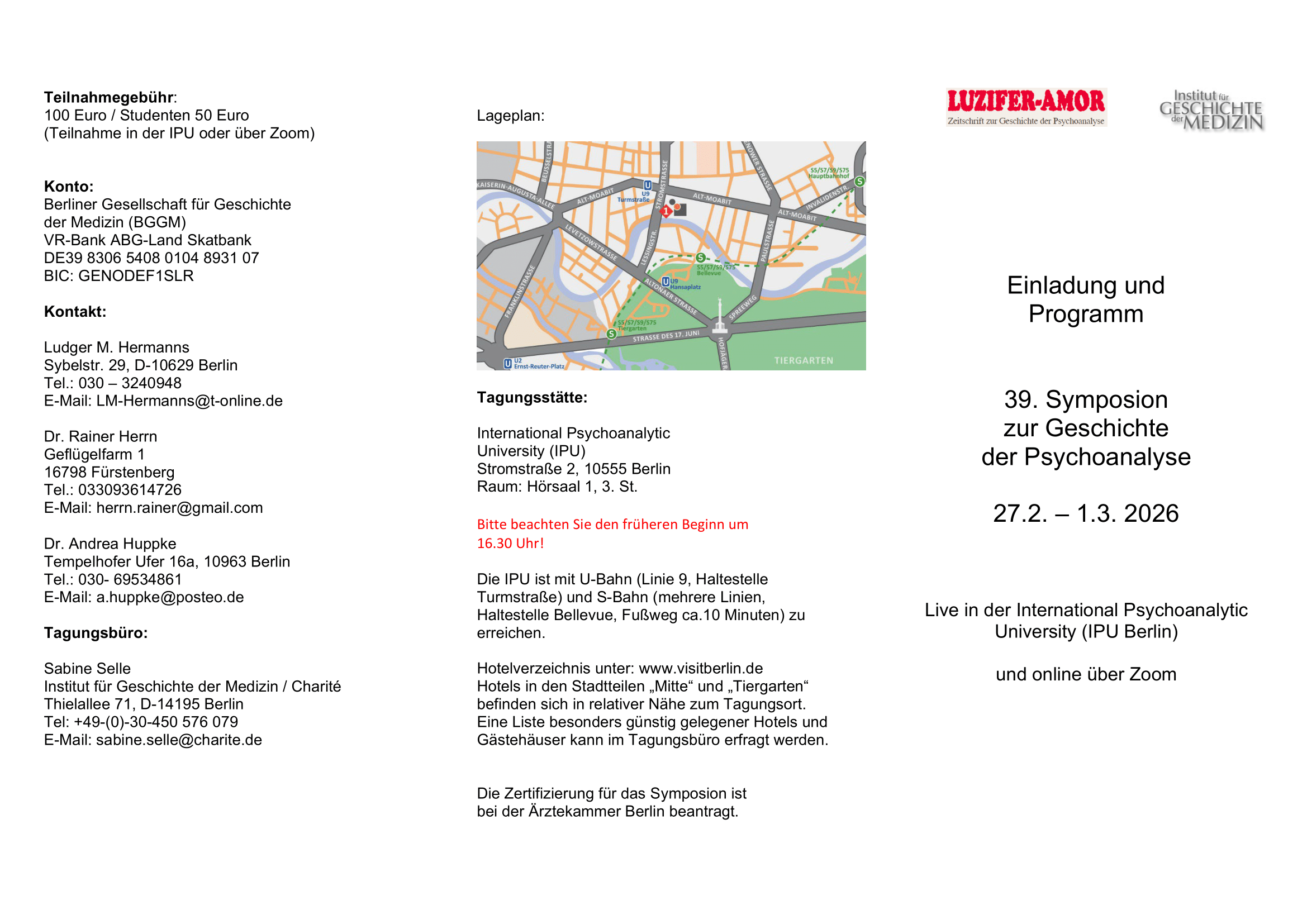 Das Symposion zur Geschichte der Psychoanalyse findet jährlich Ende Februar/Anfang März statt. Gegründet 1987 in Kassel von Helmut Junker und Gerhard Wittenberger, wurde es ab 1996 von Gerhard Fichtner und Albrecht Hirschmüller am Institut für Geschichte der Medizin in Tübingen fortgeführt. Als die beiden Tübinger Organisatoren 2010 ihre Funktion aufgaben, wurde das Symposion nach Berlin verlegt, wo es bis 2020 von Michael Schröter (Berlin), Thomas Aichhorn (Wien) und (seit 2017) Rainer Herrn (Berlin) unter Trägerschaft des INSTITUTS FÜR GESCHICHTE DER MEDIZIN an der Charité (Direktor: Volker Hess) organisiert wurde. Sekretariell wird es seit 2011 von Sabine Selle (Charité) betreut. Ebenfalls seit 2011 zeichnet LUZIFER-AMOR formell als Mit-Veranstalter. Der Tagungsort war bis 2019 auf dem Charité-Gelände in Berlin-Mitte. 2020 wurde das Symposion erstmals in den Räumen der International Psychoanalytic University (IPU) abgehalten. Ab 2021 liegt die Organisation in den Händen von Ludger M. Hermanns, Rainer Herrn und Andrea Huppke (alle Berlin). Die ersten beiden Treffen der neuen Ägide musste Corona-bedingt im online-Modus stattfinden. – Für die Teilnahme werden Zertifizierungspunkte vergeben.